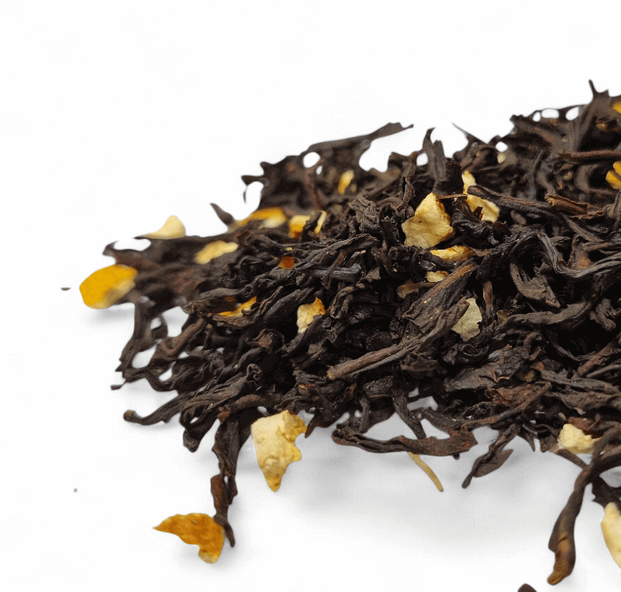 • herbata ceylon czarna, skórka pomarańczy, liść maliny, aromat.
